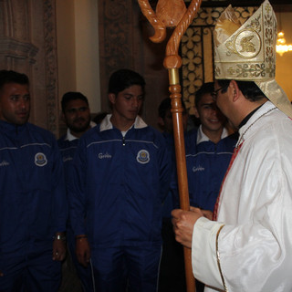 El sacerdote Santana recibió a todos los participantes; la entrada al templo fue encabezada por Alejandro Lonngy, quien llevaba un cuadro con la imagen del Señor de La Piedad; seguidos por los demás jugadores que caminaban con las ofrendas correspondientes.